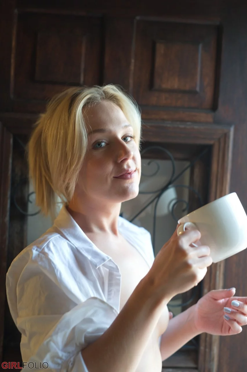 Блондинка Астон Уайлд раздевается в дверном проеме за чашечкой кофе