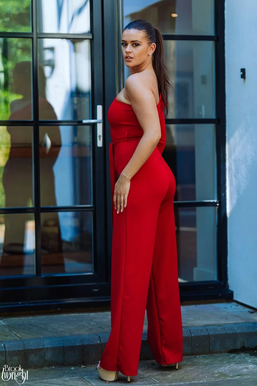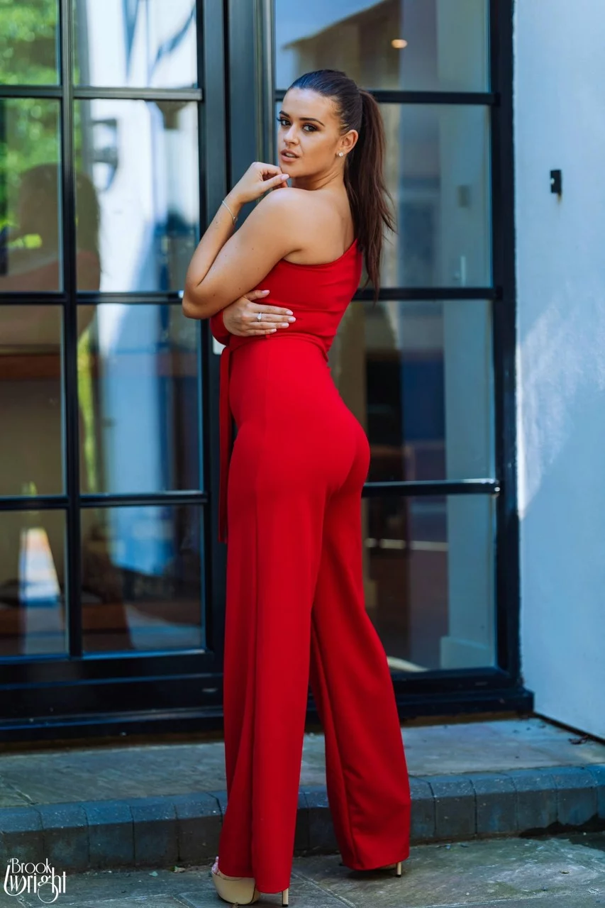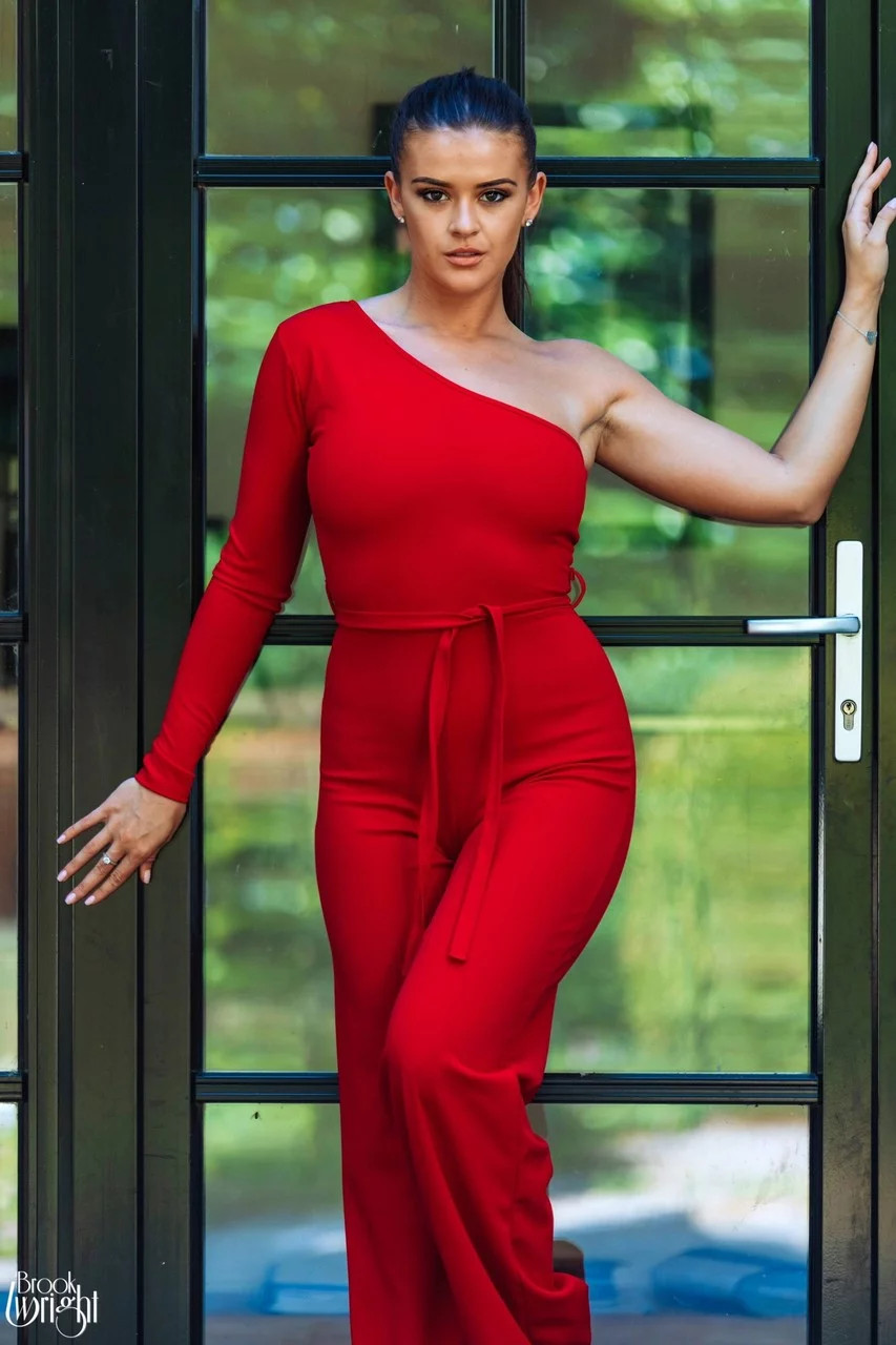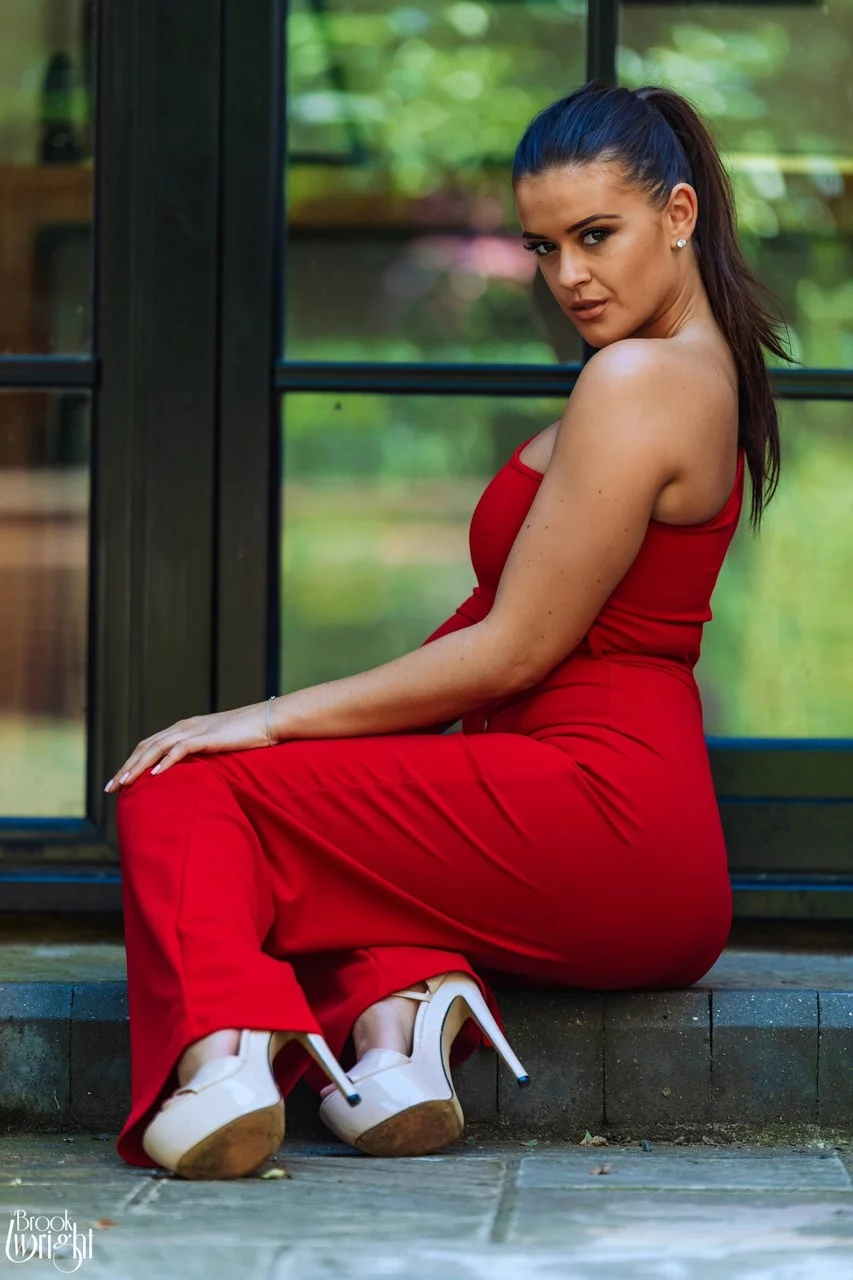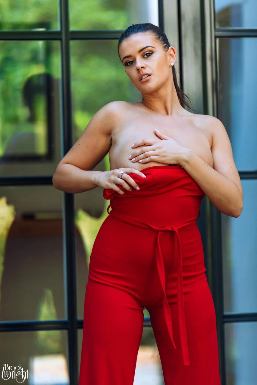 Британская красавица Брук Райт (Brook Wright) обнажает свои большие сиськи из-под красного брючного костюма