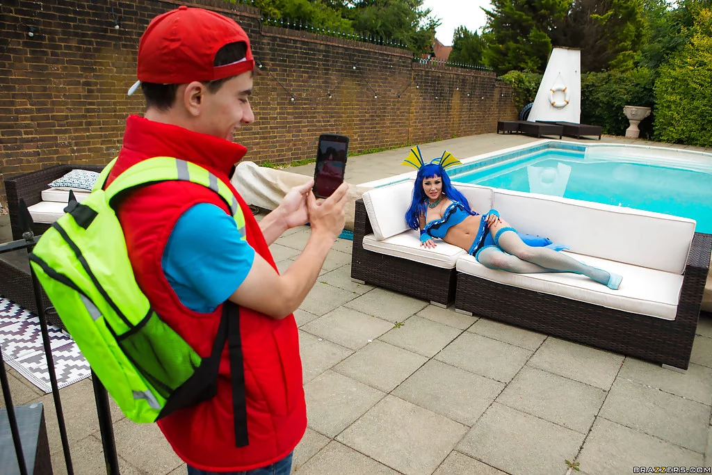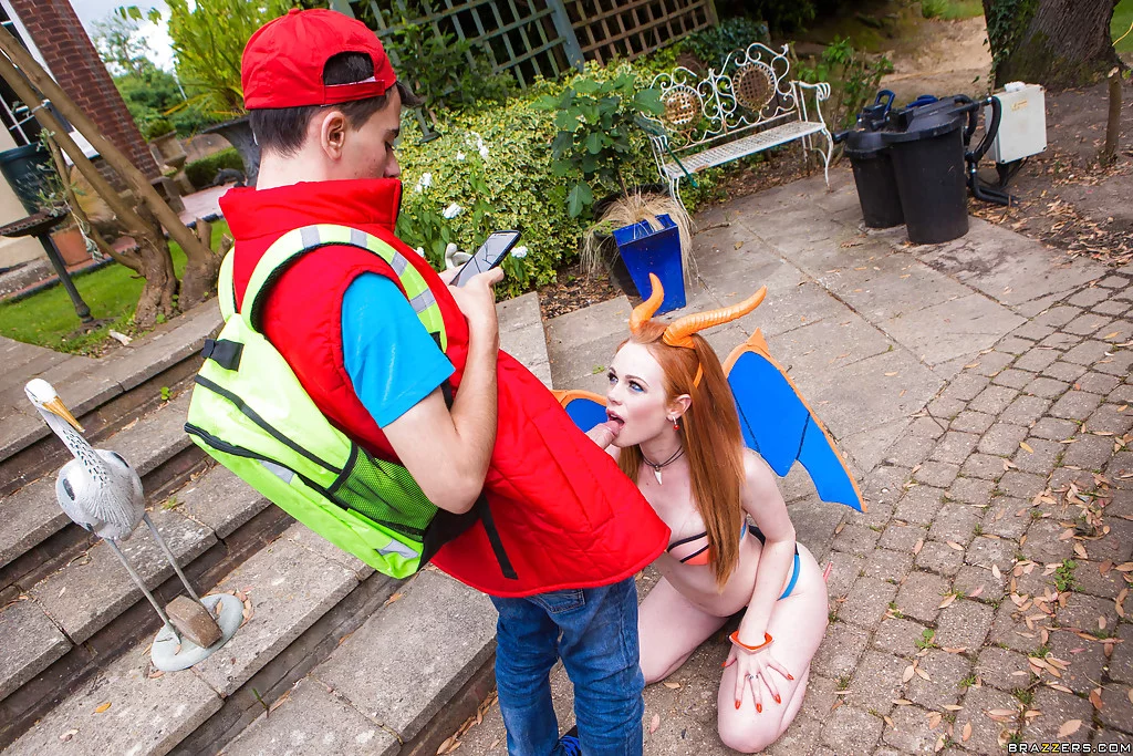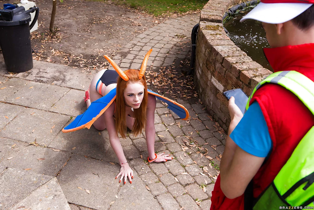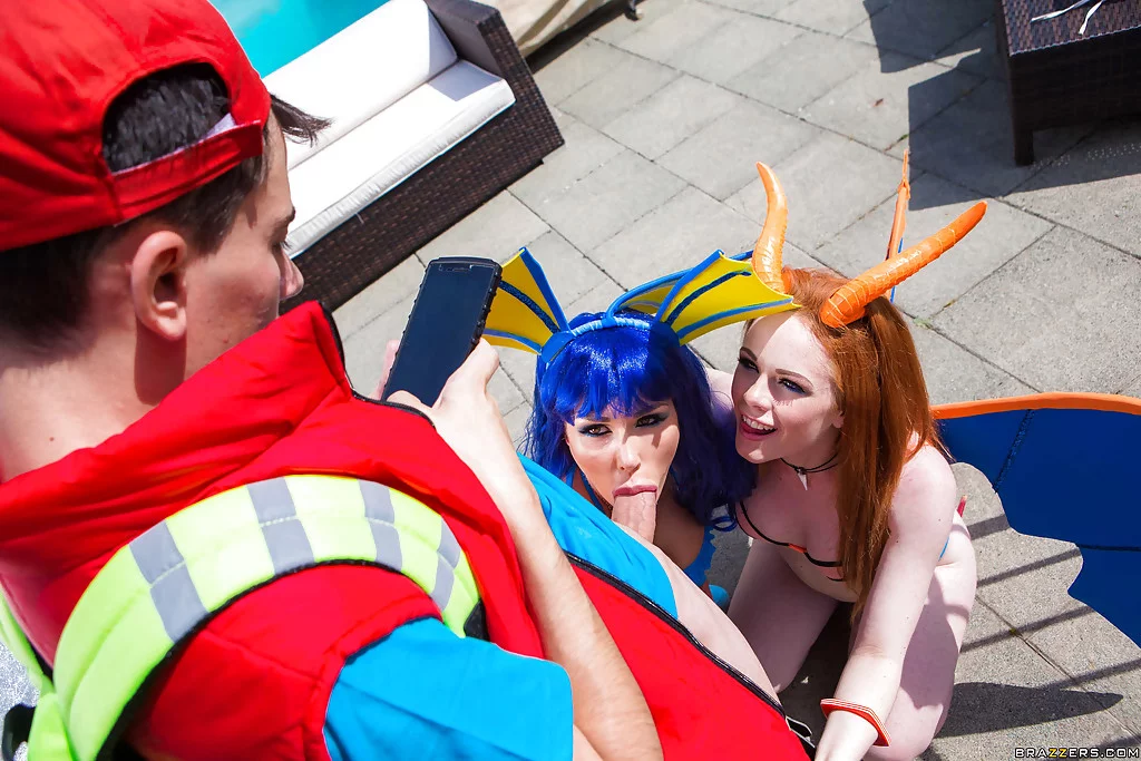 Европейские порнозвезды в костюмах для косплея занимаются оральным сексом с огромным членом на открытом воздухе