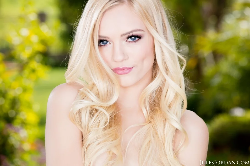 Горячая белокурая цыпочка Алекс Грей снимает свой комбинезон на заднем дворе