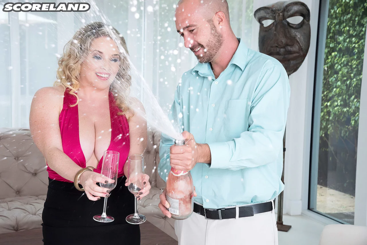 Грудастая блондинка Мэгги Грин занимается сексом со своим мужчиной после того, как они открывают шампанское