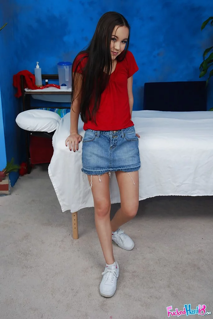 Худенькая девушка с крошечными сиськами раздевается и ложится на массажный стол