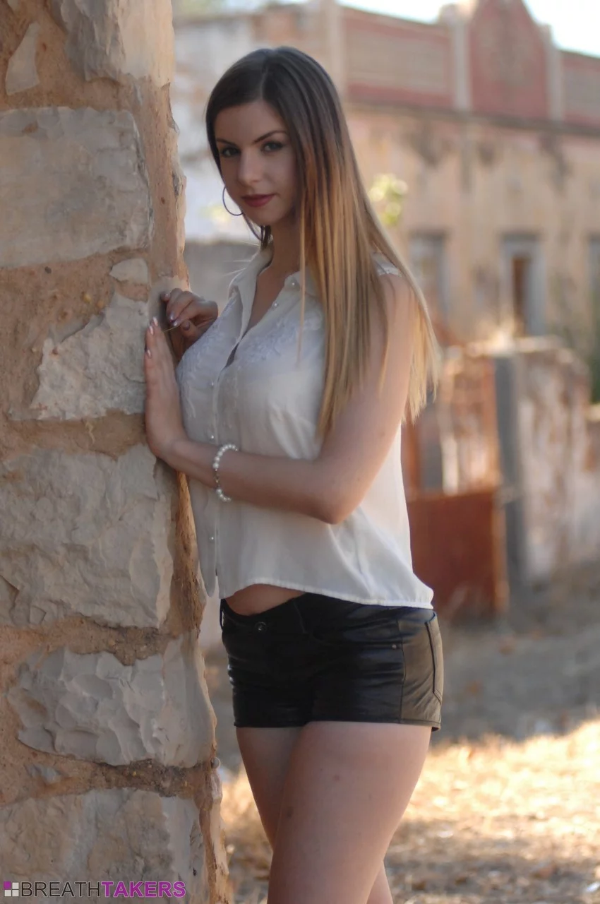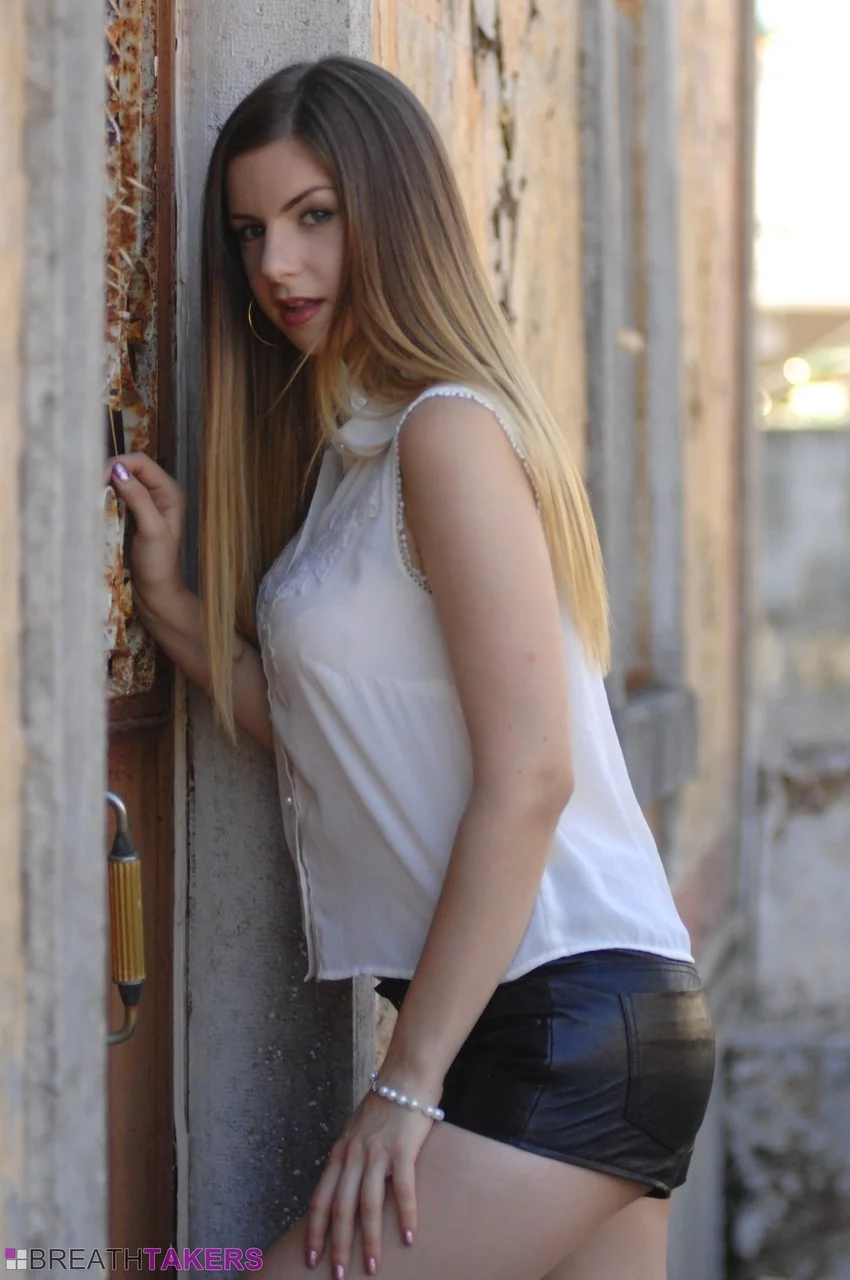 Красивая девушка Стелла Кокс медленно снимает с себя одежду, чтобы выйти обнаженной на улицу