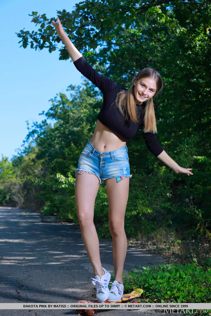 Молодая девушка-одиночка Дакота Пинк обнажает свое божественное тело на мощеной дороге