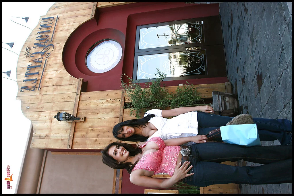 Сексуальная брюнетка с огромными сиськами позирует со своей подругой на открытом воздухе